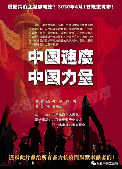 《中国速度 中国力量》是一部激荡精气神、弘扬正能量的微电影,记录了抗击新冠肺炎疫情的中国行动,讲述了火神山医院建设背后上演的争分夺秒的生死竞速。在党中央的周密部署、精心安排下,150多家单位奋力参与,现场4000余台施工车辆日夜穿梭,7500多名建设者从五湖四海汇聚知音湖畔,24小时不间断开工,只用10天时间就建成了一座总建筑面积3.39万平方米、拥有1000张床位的火神山医院。该片以翔实的数据、灵动的画面、舍我其谁的气势,展现了伟大的中国抗疫精神,诠释了磅礴的中国文化力量,是一部内涵丰富又喜闻乐见的抗疫宣传片。疫情面前,东城文艺工作者用微电影记录下中国抗疫的动人图景,也是向所有抗疫奉献者致敬!
