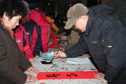 在现场书法家们个个精神拌搂、饱蘸浓墨免费为当地百姓送去了1100多幅春联;民间艺术家们激情洋溢、精裁细剪给当地百姓剪出了300多幅窗花和百姓特别喜欢的老鼠生肖图,活动受到了当地群众的热烈欢迎。