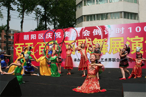4月26日,由朝阳区人文奥运建设指挥部办公室、朝阳区文化委员会主办,朝阳区文联、朝阳区文化馆承办的“朝阳区迎奥运倒计时100天 百天百队百歌舞展演活动”在朝阳区文化馆广场拉开了帷幕。朝阳区委宣传部副部长、区精神文明建设办公室、区人文奥运建设指挥部办公室主任兰学军,朝阳区文化委副主任徐伟,朝阳区舞协主席方伯年参加了开幕式,朝阳区文联副秘书长金童主持了开幕式。