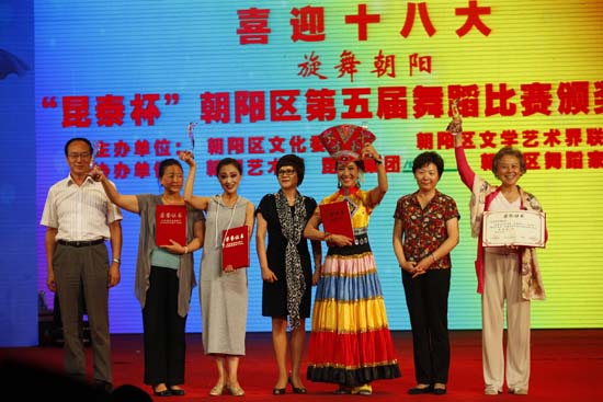 在热烈庆祝市第十一次党代会闭幕之际,怀着对十八大的期盼,由朝阳区文化委、文联、朝阳艺术团、昆泰集团、舞蹈家协会共同举办的“旋舞朝阳‘昆泰杯’”第五届舞蹈大赛于6月中旬至7月初举行。7月5日,进行了决赛和颁奖典礼。区委常委、宣传部部长、统战部部长谢莹、区人大副主任朱春霞、区政协副主席郑煌、区文化委主任、文联党组书记黄晓伟、昆泰集团副总经理田京营等领导出席了颁奖典礼并为获奖单位颁奖。