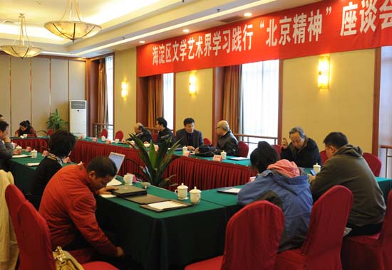 大家认为,对于艺术家和文艺工作者来讲,爱国是基本前提,是文艺创作的永恒主题;创新是基本动力,是文艺创作的生命力所在;包容是基本及安置取向,是文艺创作的现实需要;厚德是基本要求,是文艺创作的重要使命。宣传贯彻北京精神,文学艺术界要走在前列,为建设海淀人民的精神家园作贡献。