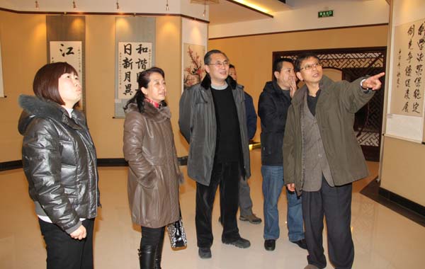 市文联党组副书记王德新(右一)在龙乡书画苑参观