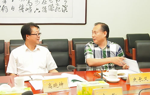 区文联主席史长义(右)与区委组织部副部长高晓坤(左)座谈