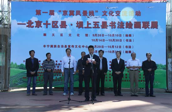 9月26日,第一届“京冀风景线”文化交流活动——北京十区县与坝上五县书画联展在顺义区文化馆拉开了帷幕。此次联展将展出北京十区县、河北省坝上五县书画家的书画作品140件(书法、绘画各70件)。其中特邀内蒙古自治区书画家参加展出。北京文化艺术活动中心主任路斌,顺义区人大教科文卫主任杨国英, 顺义区政协教科文卫主任刘炳武,顺义区文化委员会主任刘振河,丰宁满族自治县县委常委、宣传部部长时国轻等领导出席。
