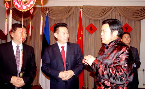 中国龙王王玉玺同中国驻爱沙尼亚大使馆黄忠坡(中)大使亲切交谈