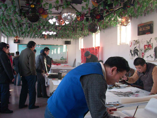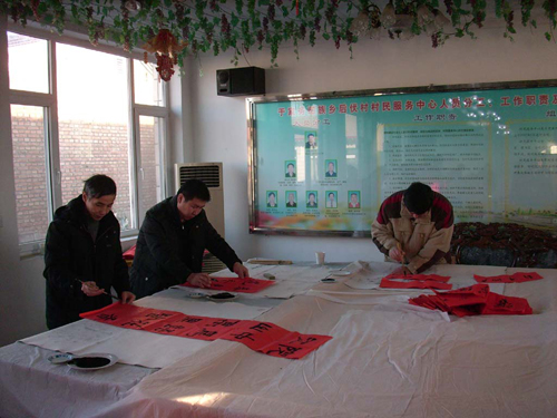 2009年1月18日,是我国农历小年,由通州区文学艺术界联合会组织的通州书画家驱车三十多公里,来到于家务乡后伏村,为村民们送去了党和政府的关怀,也送去了节日的祝贺。这一天也是开始为过大年(三十)而紧张准备的日子,民间从这一天起,一直到除夕止,几乎每天都在为过年而忙碌,其中就包括祭灶、扫尘、剪窗花、写春联等活动。特别是大门上的春联,是家庭的门面,各家各户都特别重视。春联内容或抒情,或写景,内容涵盖面非常广,对春联的需求数量也特别多。区文联除了将事先准备好的春联送给村民们外,书法家们还现场泼墨挥毫,按照村民们的喜好,为他们书写了充满和谐、吉祥、欢乐等内容的春联以及含有“福”、“抬头见喜”、“旺气冲天”等内容的单联一百余幅,受到了村民们的热烈欢迎。