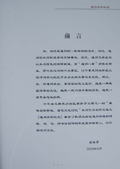 通州是一个多河富水的城市,在近代,通州因水而形成漕运仓储重地,“通州八景”多与水相依,正在建设和完善之中包括18处景观在内的运河六大景区正在向世人展现北方水乡滨水景观生态区的的宏伟蓝图,做足和水相关的文章在现代化国际新城的建设中显得极为重要。作为中共通州区委折子工程之一的“聚集国际新城,留住文化记忆”系列艺术创作工程之《2010年书法创作专集·通州水韵纵览》在内容上就是围绕着通州多河富水来进行书法创作,而且均为小品,和往年的书法创作活动相比较,难度提高了。但广大的会员们能克服各种困难,有的数易其稿,使得该作品集的整体质量有了明显提高。入选该作品集的100余件作品也从各个不同角度展示了通州多河富水以及现代化国际新城建设的文化内涵。