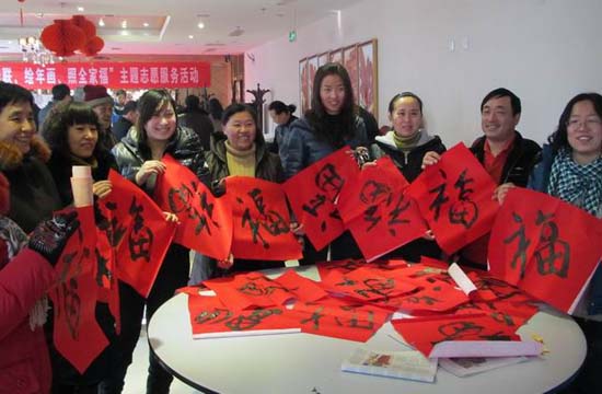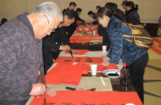 为践行北京精神,在2012年春节即将来临之际,通州书法家协会近日先后组织会员30余人次,分别随通州区文化馆、图书馆等部门深入到部队,农村和社区等基层开展送文化、写春联的活动。为了满足更多的人们对春联的需求,他们提前组织会员书写春联三百余幅,加上在活动现场书写的春联,共计书写春联近千幅。这些春联在内容上充分反映了“践行北京精神”的主旨,表达了人们享受通州新城建设成果的喜悦心情,也融进了祥和的节日氛围。无论是在部队,还是在村庄,很多人或是在书法家事先准备的春联中寻找自己中意的春联,或是请书法家们现场书写他们自己编撰的春联,有的是一家几代人都到现场亲身感受书法家现场书写春联和“福”、“龙”等字的热烈气氛,书法家们也不辞辛苦地挥毫泼墨,充分满足了老百姓对春联的需求。