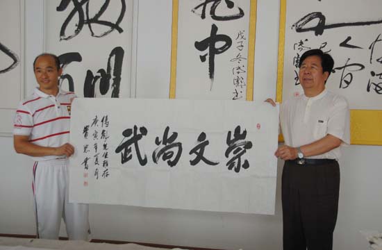 6月29日上午,昌平区主席周振华、昌平区书法家协会主席李贵忠,率领昌平书法家协会副主席王勇、聂玉峰、蔡利国等,来到北京少林武术学校参观交流。