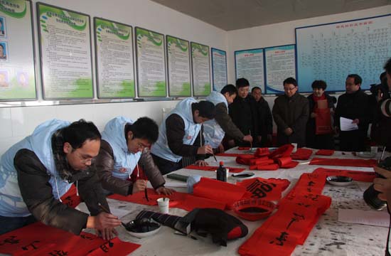 1月13日,大兴区2012年文化科技卫生“三下乡”启动仪式在庞各庄镇梨花村举行。大兴区文联主席王青海向五个优秀文化大院赠送了书画作品。同时,还组织了10余名书画名家现场书写春联,赠送农民书画作品600余幅。区文联自成立以来,始终将文化下乡作为一项重要的工作,每年坚持把丰厚的精神食粮送到社区,送到农民的家门口,积极推进了基层文化的大繁荣大发展。