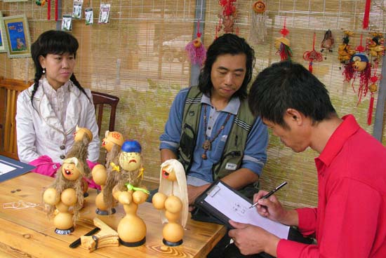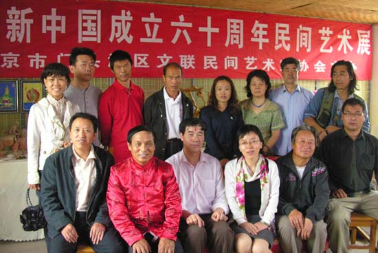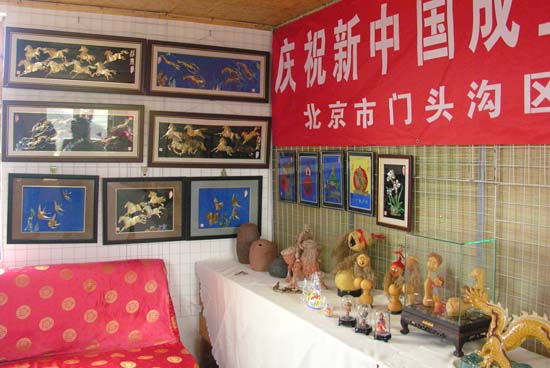 9月29日,门头沟区文联民间艺术家协会在门头沟区妙峰山镇古岸农庄举行“庆祝新中国成立60周年”民间艺术展。共展出根雕、毛猴、麦秸画、蝴蝶画、羽毛画、钢精画、石头画、水晶画、风车兔爷、葫芦漫塑、泥塑、面塑、影雕、陶艺、琉璃、民间乐器、十字绣、纸艺、木版拓片、布艺、琢瓷、编织、玻璃粘、中国结等20余种300余件民间工艺品。