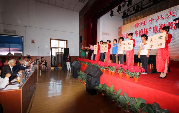 “翰墨寄情歌盛世,和谐繁荣新怀柔”,为了贯彻落实十七届六中全会精神,践行爱国、创新、包容、厚德的北京精神,繁荣怀柔文化,由中共怀柔区委宣传部、北京书法家协会、区文化委员会、区教育委员会、区文学艺术界联合会、区广电中心共同主办,区书法家协会承办的2012“喜迎十八大怀柔区“华德杯”电视书法大赛”活动于9月16日圆满落下帷幕。著名书法家、书法教育家卜希旸,中国书协理事、原北京书法家协会副主席张书范,中国书协理事 、北京书协副主席,北京教育委员会副主任杨广馨,中国书协会员、北京书协副秘书长弓超,中国书协会员、北京书协理事,北京师范大学艺术与传媒学院书法系副教授 、硕士生导师、 德国莱比锡大学汉学系客座教授虞晓勇担任了此次大赛的评委。北京华德集团职工、区书法家协会员及文联各协会代表参加了活动。