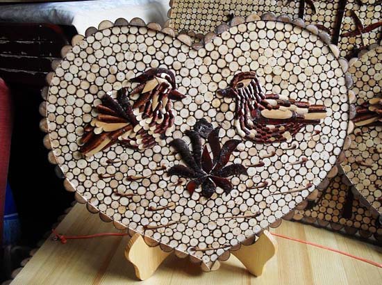 2007年一个偶然的机会,朱会萍发现有个小孩儿在玩“用废旧木头做的”玩具,她就想自己能不能也用废旧木头做点工艺品卖?回到家中,她花4个小时做出了平生第一件半成品木节画:永结同心。当时的工具很简单:一把菜刀和几把小刀。