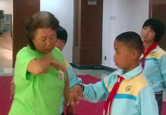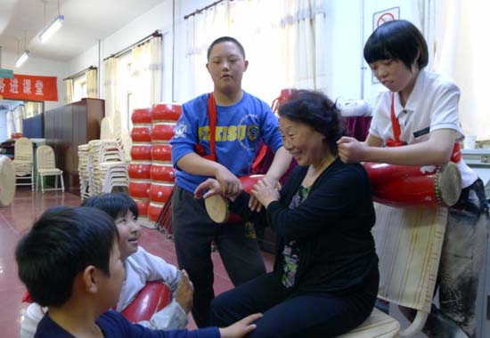 面对这样一种窘境,于老师搬来了“不厌其烦”。她通过集中授课和“一对一”、“手把手”、“玩着教”的方法来辅导孩子。每教授一个动作都要反反复复做上若干次示范,嘴上不停地说,手上不停地做,每节课下来都满脸通红、汗水顺着发际往下淌。