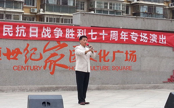 日前,由鼓楼街道办事处组织的纪念中国人民抗日战争胜利70周年专场演出活动分别在世纪家园室外广场和沿湖居民委员会文化活动中心落幕。我县戏剧家协会会员李英杰应邀参加了演出。他为大家演唱了河北梆子现代戏《沙家浜》选段“朝霞映在阳澄湖上”,赢得了现场观众的阵阵掌声,在观众的强烈要求下,他又为大家演唱了河北梆子现代戏《红灯记》选段,受到观众热烈欢迎。