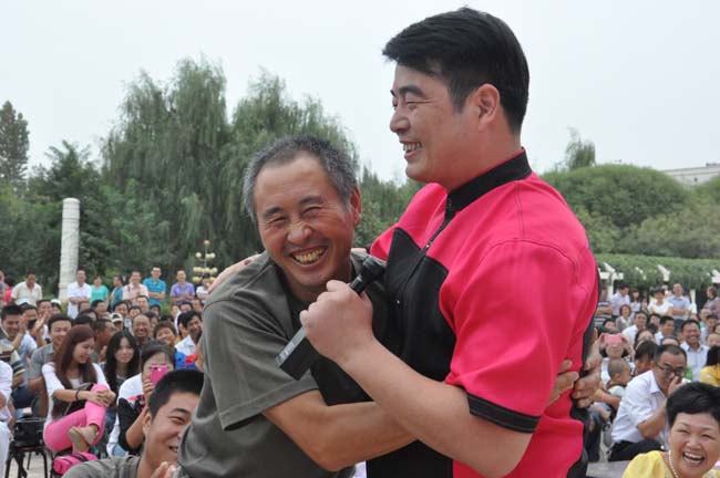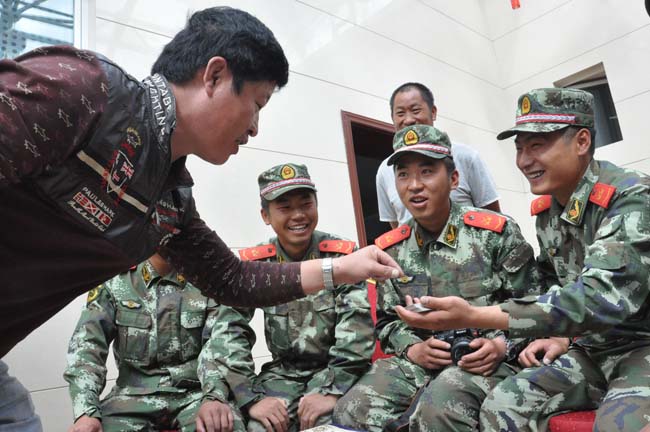 口技演员张军旗和秦玉杰在舞台上是搭档,在生活中是夫妻。这次演出,他们扮演了两只从恋爱到结婚生子的小鸟,把鸟叫声串联成具有故事情节的幽默小段,鸟儿撒娇生气的声音和形态被小两口演绎得淋漓尽致。表演过程中,张军旗还会走下台跟观众问好,逗得人们捧腹大笑。秦玉杰说,每次演出完,夫妻二人都浑身大汗,在战士们面前演时,她偶尔还会愣神,恍惚以为眼前二十岁出头的小伙子是自己的亲弟弟。提起这种感觉,她感慨地说:“这绝对是跟在北京不一样的演出,因为观众的期待值更高。他们离家戍边,父母一定很想自己的孩子,所以我们每次都抱着探望亲人的心态卖力表演,只有你离他们近了,他们才会向你靠近。”这次边疆行结束,曾经为中国母亲水窖工程做过公益宣传的秦玉杰就下决心,等女儿再大一点,一定带她走一次西部,让她通过自己的脚和眼睛丈量生命的长度和宽度。
