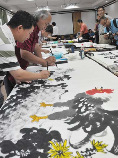 在兵团笔会上,当地画家曹建斌完成了两年来的心愿,与首都画家吴进良合作,完成了一幅以菊花和公鸡为元素的《吉祥满园长寿图》。据曹建斌讲述,去年艺术家到兵团,在旁边看得心痒手痒的他就很想与首都的画家交流,却因为担心水平不济没敢张口。今年,吴进良主动邀请他共同执笔,以一幅象征素洁高雅的菊花寓意几代兵团人开发建设大西北,将荒漠变绿洲的风骨。作品完成后,曹建斌说:“吴老师创作很注重画面的完整性,用笔果断直率,就像他的性格一样,我能感觉到有真挚的情感寄托在画里。”