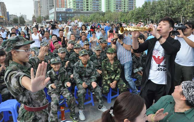 听说北京这次又来人了,而且带的都是新节目,早在去年就见识过首都艺术家风采的新疆生产建设兵团的战士们都很兴奋。8月17日一早,在空地上搭起的露天舞台,“共话京疆情,同筑中国梦”几个大字赫然入目。70岁的薛大娘和老伴搬着马扎早早到了广场,坐在头排等着演出开始。薛大娘是四川人,1953年在新疆认识了老刘,之后两人便在这里扎根,把青春都奉献给了茫茫戈壁,两个儿女也都留在新疆工作。老刘爱听京剧,来自北京京剧院的国家一级演员杨少彭的《沙家浜》选段惹得80岁的老爷子站起身拍手叫好。