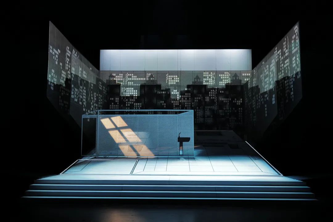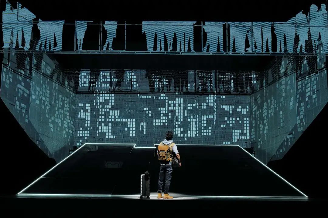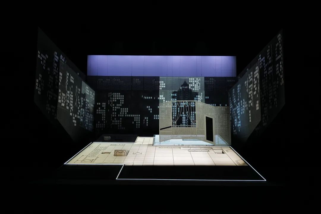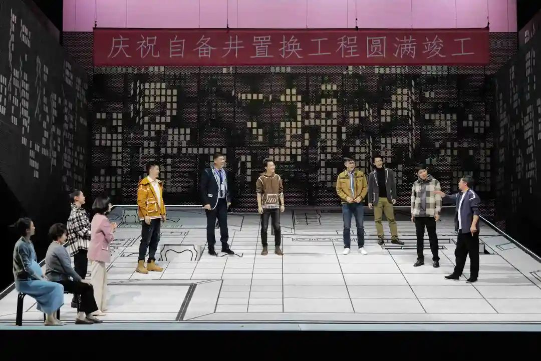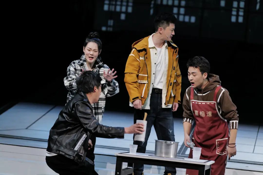 首演当晚,大幕拉开,巨大的斜坡闯入眼帘,舞台灯光和多媒体屏幕一同在舞台上抽象地展现出万家灯火,艺术性地营造出“回天”地区的氛围。斜坡上用现代感、科技感十足的平面和线条勾勒出不同空间,一个个生活场景跃然台上,观众自然而然地被带入剧情之中,并随着故事的发展,与角色的悲喜产生共鸣。