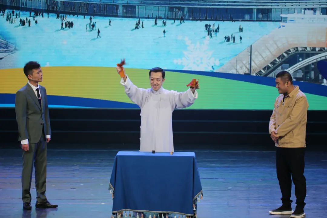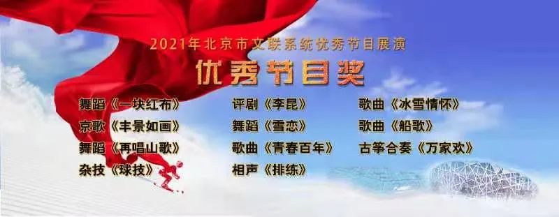 “艺映百年 情系傲雪——2021年北京市文联系统优秀节目展演”由北京作家协会、北京戏剧家协会、北京音乐家协会、北京舞蹈家协会、北京曲艺家协会、北京杂技家协会、北京电视艺术家协会、东城区文联、丰台区文联、石景山区文联、顺义区文联、大兴区文联、北京市公安文联共同协办,北京演讲与口才学会支持。此次展演,专家和导演组从各区(局)、产(行)业文联推荐的作品中精心挑选出东城区文联等单位选送的《一块红布》《李昆》《丰景如画》《踏雪寻梦》6个节目呈现在舞台上。同时,还特邀了北京音协合唱团、中央民族大学舞蹈学院、中国戏曲学院、中国杂技团有限公司、北京市杂技学校等单位的《新时代进行曲》《再唱山歌》《青春百年》《快乐星球——球技》《排练》《我们,看到了》《复兴的力量》等7个优秀节目参加演出。1个半小时,14个节目,16个单位的200多名演员倾情奉献,加上似梦如幻、意境悠远的舞台效果,引爆观众的热情,掌声欢呼声响彻剧场。抖音、快手等平台同步直播点击率达10.4万人次。