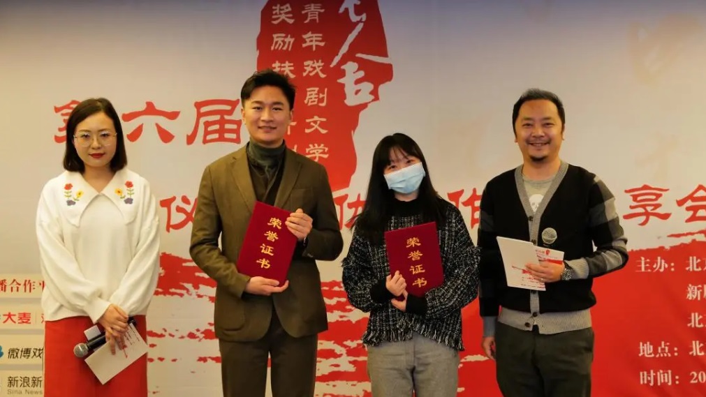 北京演艺集团党委副书记、总经理王珏,二级巡视员苏社钦,北京戏剧家协会秘书长唐晓辉,北京老舍文艺基金会秘书长罗亚琴等领导及嘉宾为作品获得荣誉的青年创作者颁奖。话剧《梦江南》(编剧:吴天)和北京曲剧《我这一辈子》(原著小说:老舍,编剧:胡铭帅)获得“优秀剧本”荣誉。儿童剧《海·羊》获得“好故事”证书,话剧《梦江南》获得“有潜力”证书。