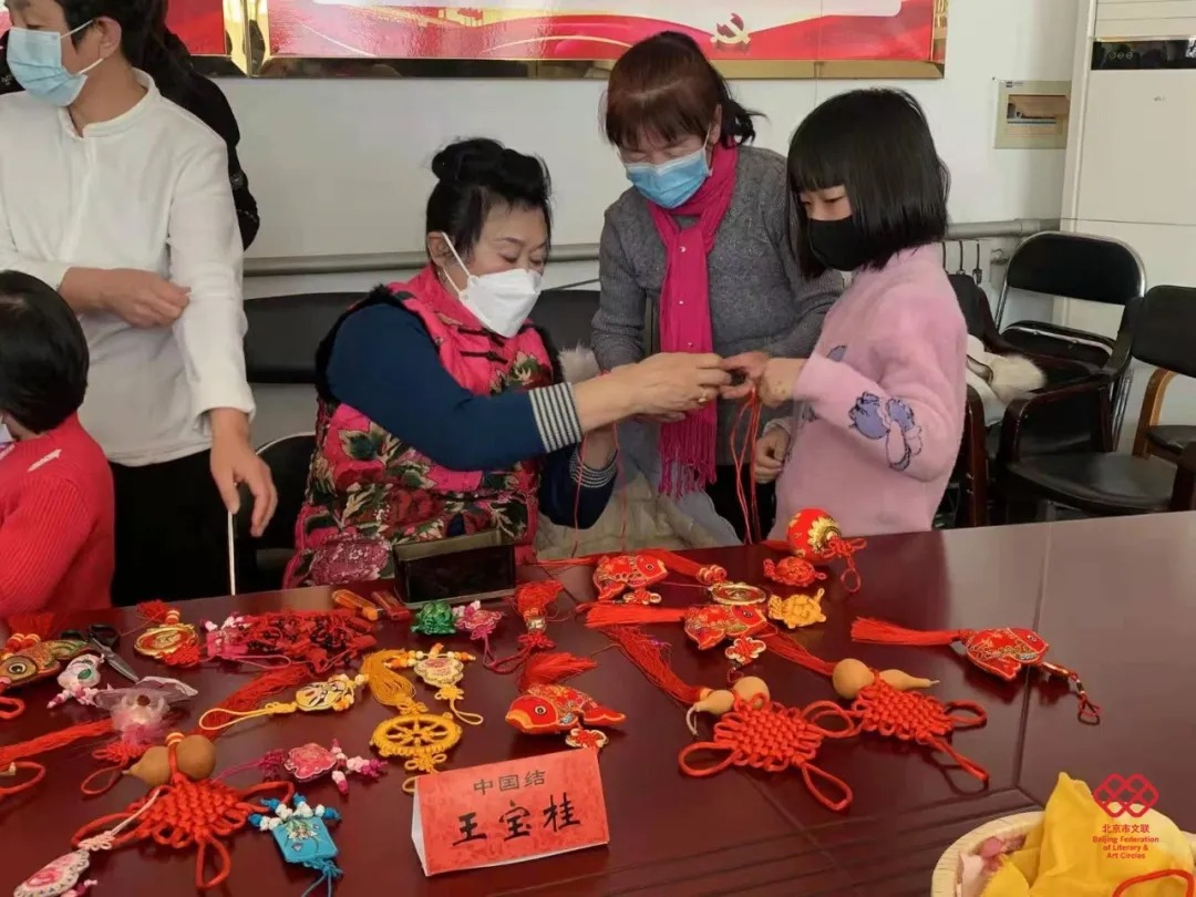 艺术家们带着自己的作品和礼物来到古军都,白秀娥和杨钺两位老师,带着村民们一起剪窗花、做虎年剪纸,把新年的祝福都化在手中的剪刀上,一阵飞舞便满是祝福;王宝桂老师带着村民们一起制作中国结,把新年的喜庆都扎进中国结里,新一年的幸福美好就这样扎成了花;刘彬彬老师给孩子们挨个做糖画,送糖人,每个孩子的脸上都洋溢着幸福甜美的笑容;河边常见的茅草,在张邦喜老师的手中像个听话的孩子,左翻右折,不一会儿就成了小青蛙、小蚂蚱、小蝴蝶和玫瑰花等各种小动物,逗得村民们好生欢喜。姚晓静老师,看似安静平和,可手中的泥可甚是“活泼”,顷刻之间,一只虎虎生威的小老虎就出现了,现场一片其乐融融。另一边,佟秀芬老师带着老人们、孩子们一起在认真地绘制老虎京剧脸谱,一起感受最传统的中国戏曲的魅力,孩子们高兴地戴在自己的头上,演绎起威风凛凛的“大老虎”。