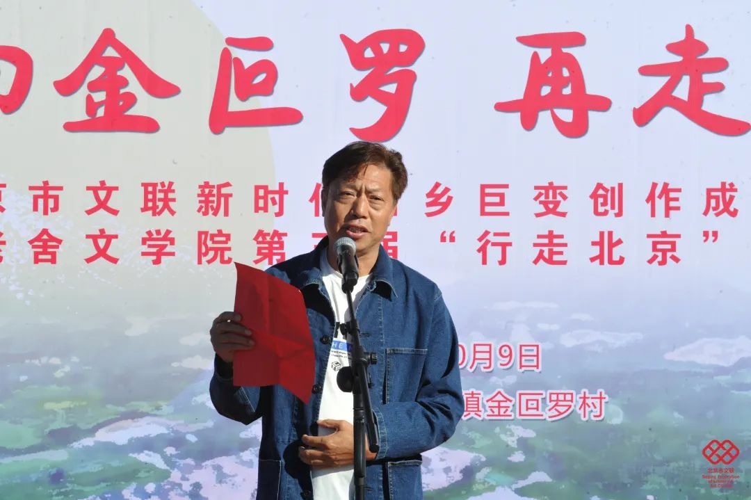 金叵罗村党支部书记、村主任王义江作为属地代表,以“归来笛声满山谷,明月正照金叵罗”开篇,感谢市文联和各级领导对金叵罗的关怀,重点介绍了金叵罗村的村情和近年发展情况,以及新农人和原住村民在产业结合方面、绿色发展的重要意义。他表示,金叵罗村会坚守“绿水青山就是金山银山”的理念,更诚恳地邀请北京作家既要常回金叵罗,更要长住金叵罗。