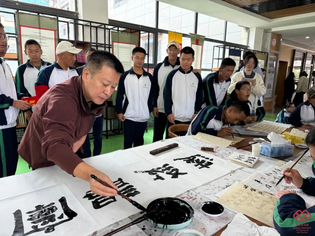 程度、徐右冰、孙健在拉萨北京实验中学指导学生书法创作,并共创作品