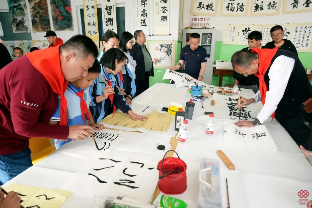 在书法指导活动现场,邢光辉、王振宇、陈勇武、邱枫等四位书画家耐心细致,从基础教起,手把手纠正握笔姿势、书写动作;庞啸晨用生动的绘画教学,指导学生画螃蟹,同学们在笔墨勾勒间感受中国画的趣味与魅力;曾在少年时代就拿过全国书法比赛大奖的摄影家崔峻,在拍摄记录美好瞬间之余,也按捺不住加入了指导队伍,与学生们交流心得。其间,一名四年级学生主动提出想写“精忠报国”,他自己一直敬佩岳飞的爱国精神,想通过书法表达这份崇敬。孩子的真诚深深打动了书法家们,不仅认真指导,还特意写下他的名字赠予他,以此鼓励他将这份爱国心永远传承下去。