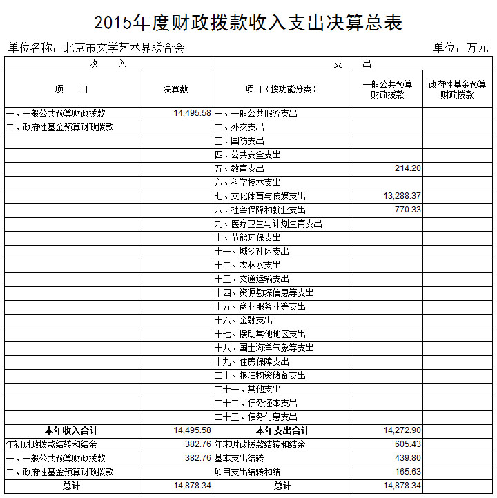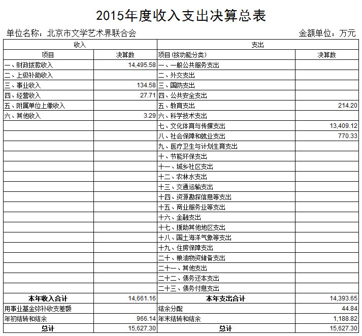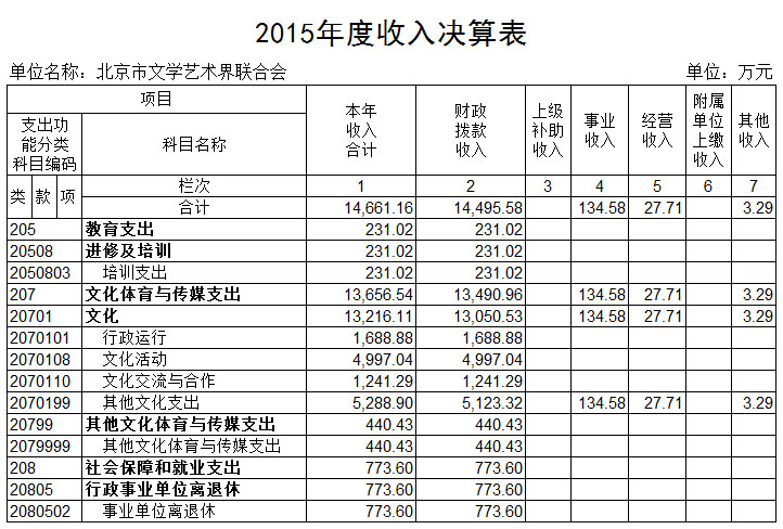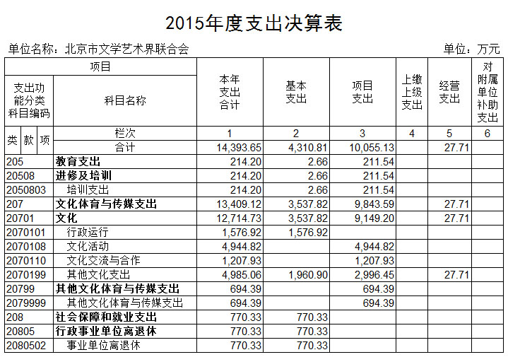 “文化”2015年度决算12,593.98万元,比2015年年初预算增加876.86 万元,增长7.48%。主要原因:一是上年结转项目“北京文联网上剧本及文艺志愿者公共服务平台”支出125.31万元;二是当年新增“北京市文联‘文艺家之家’二期设备和家具购置等相关经费”支出524.46万元、“《张志明诗百首》作品研讨会”支出5.76万元、“文联大楼部分屋顶结构拆除改造”支出58.88万元、“北京文联与北京代氏影视文化有限公司房屋租赁合同纠纷赔偿金”支出112.07万元、“文学托起梦想-北京市中小学教师原创文学征文活动”支出52.4万元。