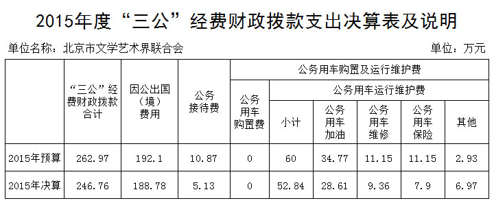 2015年“三公”经费财政拨款决算数246.76万元,比2015年“三公”经费财政拨款年初预算262.97万元减少16.21万元。其中: