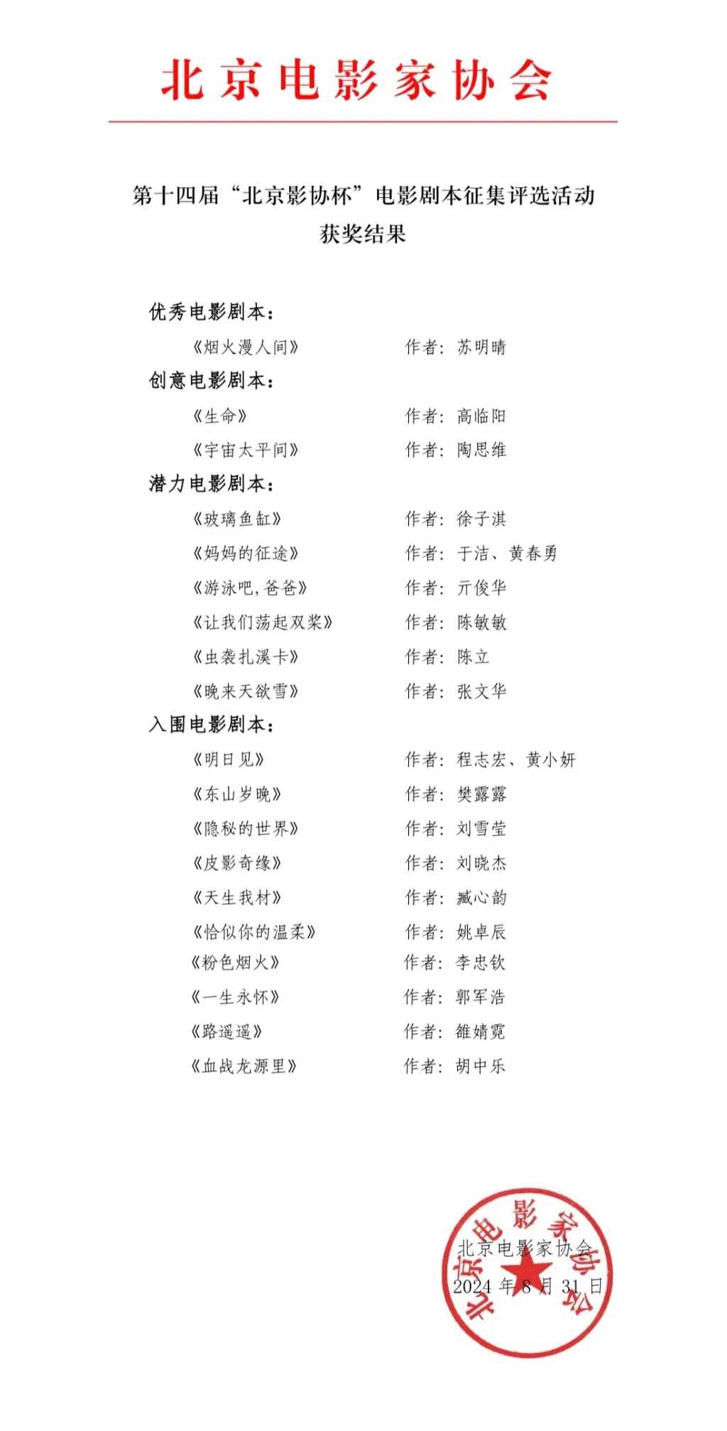 8月31日,由北京市文联主办、北京电影家协会承办的第十四届“北京影协杯”电影剧本征集评选活动终评会在京顺利举行。活动共评选出优秀电影剧本1部、创意电影剧本2部、潜力电影剧本6部以及入围电影剧本10部,具体名单如下: