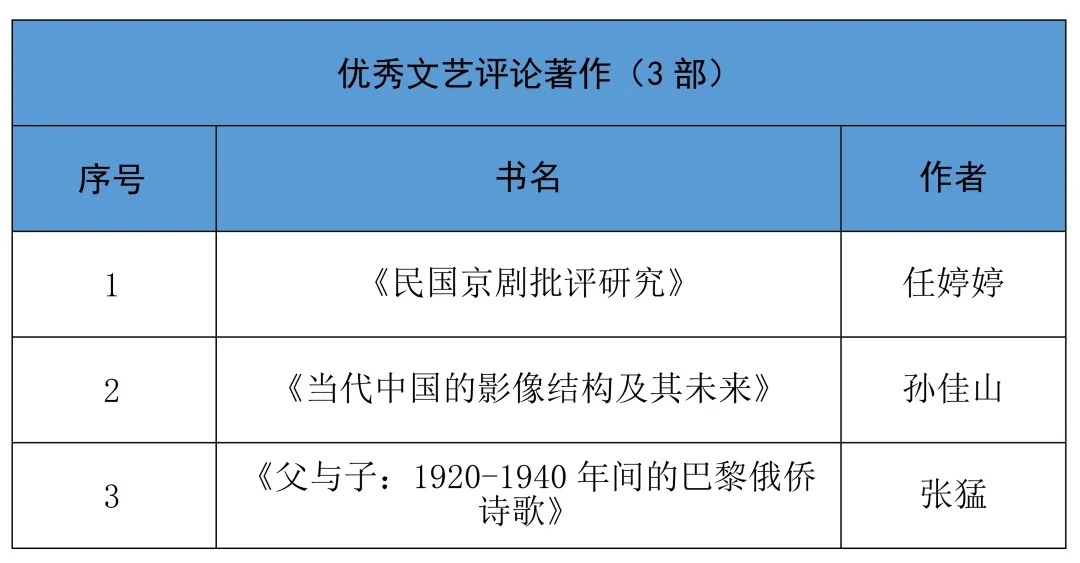 2024年,由北京市文联主办的北京文艺评论年度推优,面向市文联所属13家文艺家协会、事业单位,北京高校文艺评论联盟成员单位广泛征集评论作品,覆盖文学、戏剧、美术、音乐、舞蹈、曲艺、电视、电影等多个艺术门类。经过专家讨论评议,最终评选出2024年度优秀文艺评论著作3部、优秀长评10篇、优秀短评9篇。
